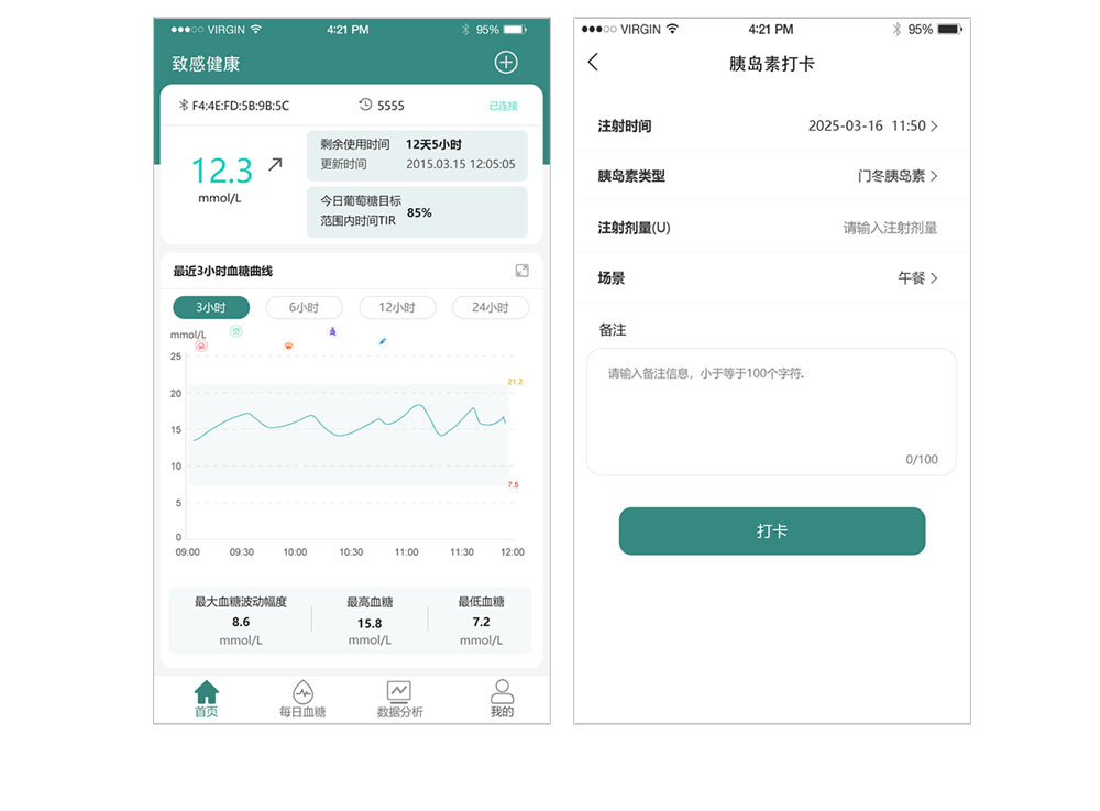 致感健康app是我司为聚交芯创客户配套开发的蓝牙通讯的动态血糖仪app软件,基于跨平台开发技术,首次上线Android 平台。具体功能如下: